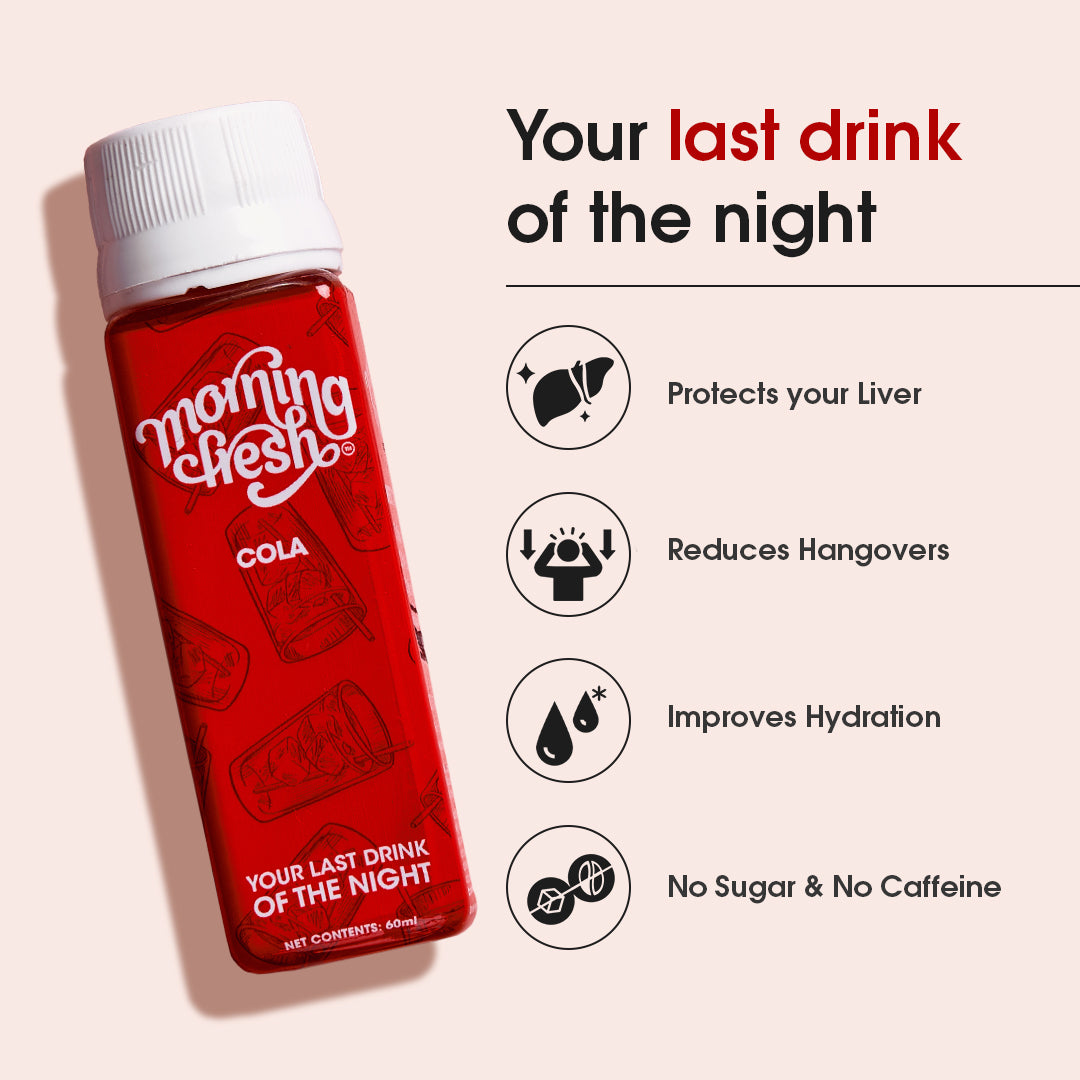 Meet our anti-hangover drink in a refreshing cola flavour! It’s formulated with essential vitamins, proteins, and electrolytes to keep your liver healthy. When you drink, make Morning Fresh your last drink of the night. It helps your body recover and reduce the damage done by alcohol so you wake up fresh, and hangover-free.