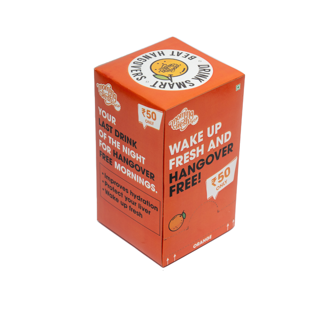 Meet our anti-hangover drink in a tasty orange flavour, that fits in your pocket! It’s formulated with essential vitamins, proteins, and electrolytes to keep your liver healthy. When you drink, make Morning Fresh your last drink of the night. It helps your body recover, replenish and reduce the damage done by alcohol so you wake up fresh, and hangover-free.