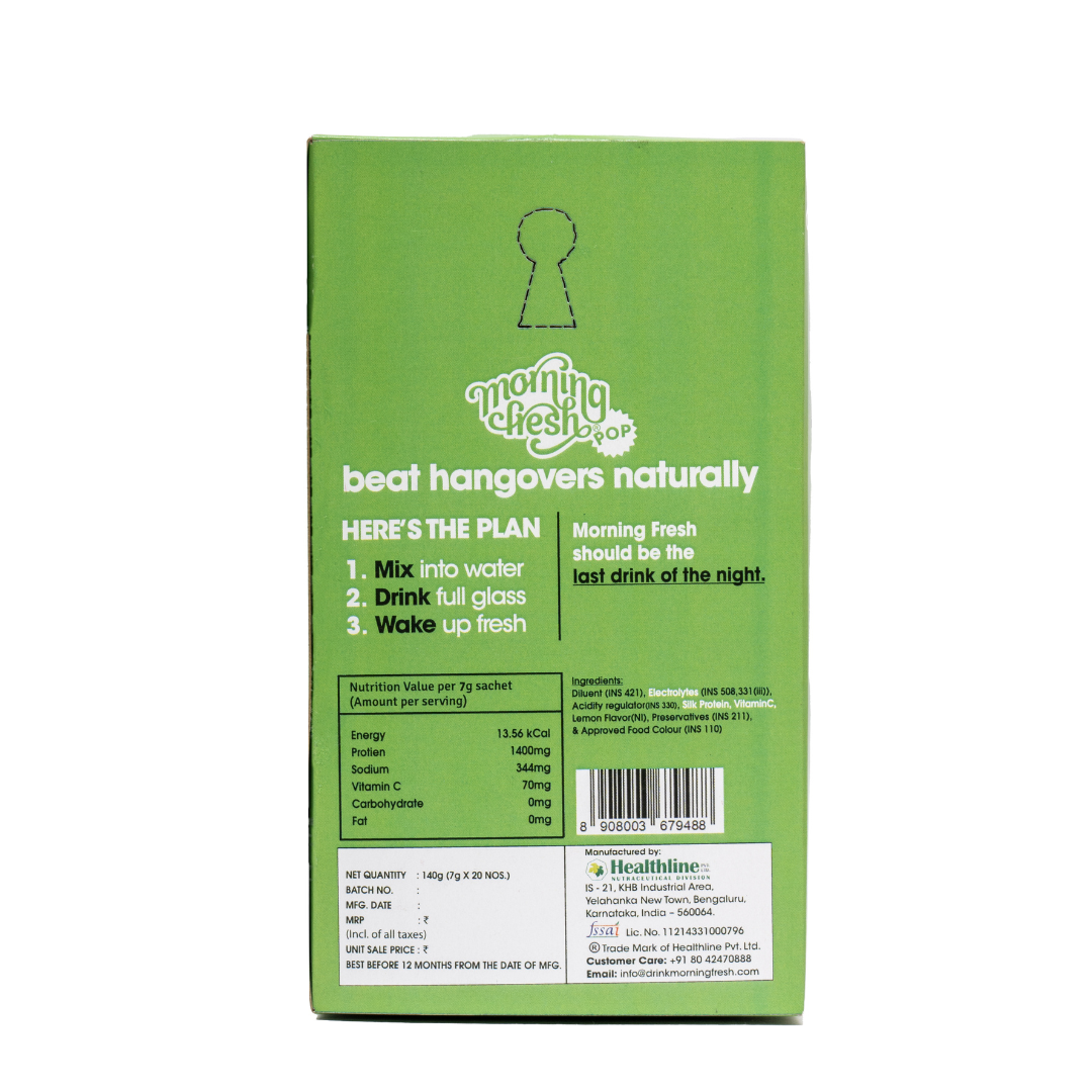 Meet our anti-hangover drink in a fresh lime flavour, that fits in your pocket! It’s formulated with essential vitamins, proteins, and electrolytes to keep your liver healthy. When you drink, make Morning Fresh your last drink of the night. It helps your body recover, replenish and reduce the damage done by alcohol so you wake up fresh, and hangover-free.